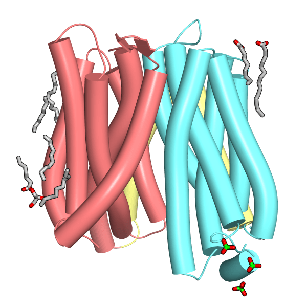 Transmembrane helices of POT (4IKV) shown with cartoon-cylinder model of different smoothness (2.0, 3.0, and 5.0 for left, center, right panels, respectively).