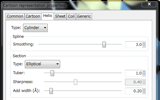 At the top-level "Type:" option, you can choose cylinder or ribbon for the helix representation. Cylinder-helix settingsSpline smooth (helix_smooth)This setting specifies the smoothness (or straightness) of the cylinders. The value affects the shape of the cylinders as follows: