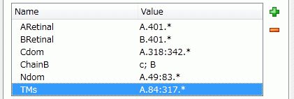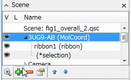 Retinalの色を定義Step2の操作と同様にして,上記の表の色(ARetinal, BRetinal)を定義します. 操作方法の詳細はStep2を参照してください. 定義後は,dialogは以下のようになります. Retinalの選択を定義Step2の操作と同様にして,上記の表の選択(ARetinal, BRetinal)を定義します. 操作方法の詳細はStep2を参照してください. 定義後は,dialogは以下のようになります. (本来なら,B分子のretinalの選択もクリックしたりして調べておいてから定義するものだが詳細は省略) 定義が完了したら,OKボタンを押してstyleを登録します. CPKモデルの表示次に,上記で選択したretinalに対応するCPK rendererを作成します. Sceneパネルで3UG9_ABをクリックして選択し,パネル下方の+ボタンを押すと,3UG9_ABへのrendererを追加するdialogが表示されます. そして,