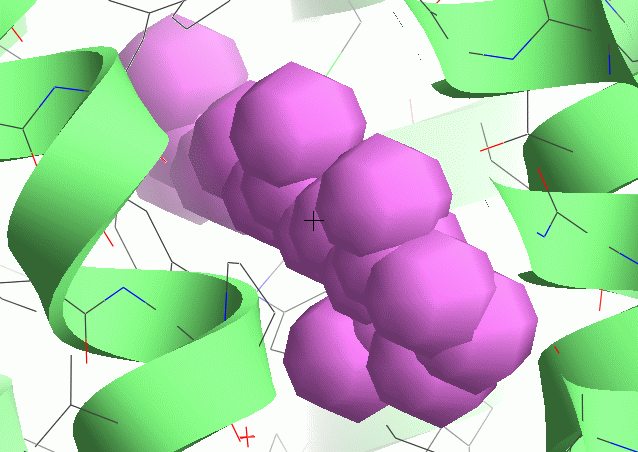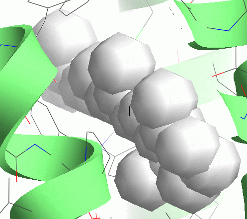 次に,viewを操作してTMの中心付近を見ると,retinalがあることが分かります. A分子のretinalの原子のいずれかをdouble clickすると,retinal残基が選択されます. 補足