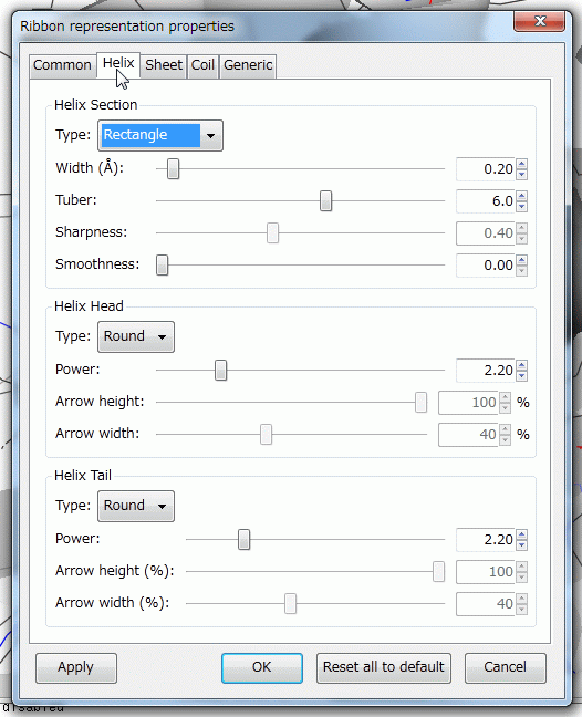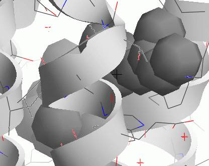 に変更しOKボタンをおします. この状態では,B Retinalの色がChainB (うすい灰色)になっています. この色を,前項で定義したBRetinal色(濃い灰色)に変更します. 前項同様に,まずColoring panelで「3UG9-AB」を選択し,「+」ボタンを押して塗りを追加します. するとDialogが出てきますので,色をBRetinalに,選択もBRetinalにし,OKを押します. 以上の操作を行うと,B鎖のretinalが下図のような表示にまります. リガンドが見やすいように,helixを細くする次に,ヘリックスのリボン表示にretinalが隠れてしまって見づらいので,リボンを細くします. まず,Sceneパネルのribbon1 (ribbon)という項目(蛋白質主鎖全体のリボン表示renderer)をダブルクリックします. すると設定ダイアログが表示されます. 次に,ダイアログ中にあるHelixタブをクリックし,Helixに関する設定を表示させます(上図は既にhelixタブが選択された状態). そして,Tuberの値を6→4に減少させます. OKボタンを押してdialogを閉じると,ヘリックスの表示が細くなります. さらに,Sceneパネルを操作しsimple1 rendererを非表示にし, さらにViewをタンパクの正面から見るように調整すると, 以下のような表示になります. ※Tuber値の意味
