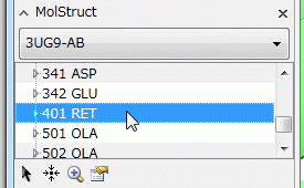 MolStructパネルを使用して選択するMolStructパネルを使用した選択は, 目的分子等の残基名が分かっている場合に便利です. 分子中でretinalはRETという残基名になっており, 残基番号はタンパク質残基より後になっています. MolStructパネル (詳しい使用方法等は GUI tutorialを参照) には,以下のようにchain A, Bがあります. ここでは,chain Aのretinal分子を選択したいので, Aを開いて,スクロールしてその中からRETという残基名の項目を探します. はじめの方はタンパク質残基なので,下の方までスクロールして探すとすぐに見つかります. 見つかったら,「401 RET」という項目をクリックして,