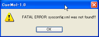 Windows版バイナリー配布からのinstallまず,Downloadのページからinstallerをdownloadしてください. Installerを実行する前に一般的な他のソフトウェアと同じように,インストーラーを実行すると インストールされます.前のバージョンが既にインストールされていると 問題なく上書きされるようですが,uninstallしてからinstallしたほうが 無難でしょう(コンパネ→プログラムの追加と...からuninstall出来ます). 注意: Installerの実行英語でいろいろ出てきますが,基本的にはウィザードのNextボタンを押していけばインストールは完了します. ActiveXのinstallVersion 1.1.0.108以降では,途中の画面でActiveXコントロールの インストールに関するオプションが増えています. Register the CueMol ActiveX Controlをチェックすると, 分子表示用ActiveXコントロールがインストールされます. はじめのインストールでインストールし忘れた場合でも, インストーラーをもう一度起動して,上記画面でチェックを入れた上で インストールすれば,後からActiveXコントロールをインストールすることが出来ます. Uninstallは,CueMolのuninstallと同時に,uninstallされます.ActiveXコントロールだけuninstallする方法は今のところ設けていませんが, ActiveXコントロールを兎も角も削除したい場合は, CueMolディレクトリにある,「CueMolCtl.ocx」を削除してください. 起動時のエラーについて (Version 1.0.0)普通にインストールすれば,だいたい普通に動くのですが, バージョン1.0.0ではいくつかの条件で,ちゃんと動かなかったりします. 例えば,Administratorでインストールして権限の低いuserで動かすと 起動時に以下のようなエラーが出ます. この状態でOKして起動すると, メッセージのとおり,"sysconfig.xml"という設定ファイルが正しく 読まれていないため,ちゃんとモジュール等が ロードされていない状態で上がってしまい,機能がまったく使えません. "sysconfig.xml"はCueMolがinstallされているdirectoryにあるはずなので メニュー”Edit→Preferences...”で環境設定のdialogを出し,Systemタブ にある"System configuration file location"に正しいdirectory名を 入れてやって,CueMolを再起動すればOKのはずです. Version 1.1.0以降では,adminより低い権限のユーザーでも, そのユーザーが書き込めるフォルダーにインストールすれば, 問題なく動くようになりました. Sourceからのinstall