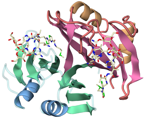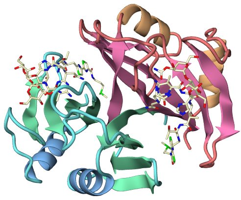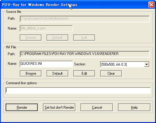 例えば,この_blm_ab_p_texの定義を変えることで, リボンの質感を変更します.ここでは,先ほど定義しておいたtex_of_hscに変えます. #declare _blm_ab_p_tex = tex_of_hsc また,色についても,_blm_ab_p_col0〜5を変更することで,この時点でも変更可能です. さらに,リガンドのテキスチャも変更しておきます. #declare _blm_ab_blm_tex = tex_of_resid POV-Rayでレンダリング次に,以上で変更したファイルをPOV-Ray windows版(ver3.6) でレンダリングする場合の手順を説明します. まず,デフォルトのiniファイルでは画像のアスペクト比がおかしいので iniファイルを作成してやる必要があります. POV-Rayを起動してメニューの"Render"→"Edit Settings/Render"を実行すると ダイアログが表示されます. ダイアログの真ん中あたりの"Browse"ボタンで 表示されるファイルダイアログから"quickres.ini"ファイルを選び, さらに"Edit"ボタンを押すとエディターにその内容が表示されます. デフォルトのエントリーでは正方形のアスペクト比の定義がないので, エディターを使って以下のエントリーを新たに追加してやります. [500x500, AA 0.3] Width=500 Height=500 Antialias=On Antialias_Threshold=0.3 もう一度メニューの"Render"→"Edit Settings/Render"を実行して iniファイル設定ダイアログを表示し, Nameのところに"quickres.ini"が選択されていることを確認して, Section:から,先ほど作成したエントリー(500x500なんちゃら)を選んで Renderボタンを押すとレンダリングが始まります. この画像をレンダリングした編集後povファイル: ちょっと暗い感じがします.こういう場合 Photoshopなどで明るさ・コントラストなどをいじってやってもよいのですが, povファイルの光源設定を変えるのが良いでしょう. light_source {<_stereo*_distance*0.05,0,_distance> color rgb <1,1,1>}