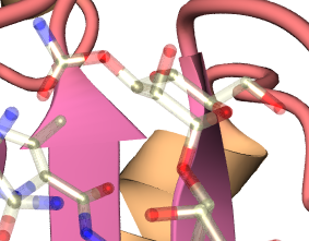 通常の出力では色の定義が0〜5まで分かれていましたが, ここではテキスチャの定義として分かれています. すなわち_blm_ab_p_tex0〜5を変更することで シート・へリックス・コイル部分のテキスチャを独立に設定できるわけです. また,incファイル内でpigmentの上書きを行っていないので, 木や大理石等のテキスチャが正しく反映されるという利点もあります. ここでは,_blm_ab_p_tex3〜5を以下のように書き換えてレンダリングします. #declare _blm_ab_p_tex3 = texture{ T_Chrome_4D };
