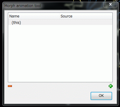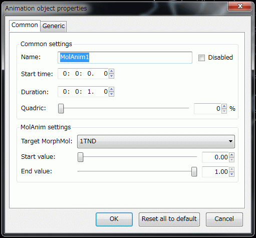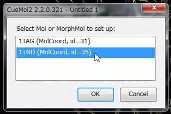 前準備ここでは,transducin-alphaのGTP bound form (1TND) とGDP bound form (1TAG) 間の構造変化を例に説明します. この2つの構造は分子としてはほとんど同じですが,各々PDBファイルに含まれる分子の位置が違ってしまっているため, まず両者を重ね合わせたPDBファイルを作成する必要があります. この例では,1TAGを1TNDに重ね合わせることとします. ファイルの読み込みと重ね合わせまず,1TAG, 1TND両者のファイルを読み込みます.PDBのサイトからダウンロード後「Open File...」から読み込んでも良いですし,「Get PDB using accession code...」を使用して直接PDBのサイトから読み込んでも構いません.(Documents/GUIのチュートリアル(CueMol2)/Step1参照) 1TAGは1つのchain(A)のみですが,1TNDは3つのchain (A,B,C)を含んでいます.1TAGは分子全体を,1TNDはchain Aに対してのみtrace rendererで表示させます. 次に,cuemol2/MolSuperposeの「Secondary Structure Matching」に従って,2つの分子を重ね合わせます. 1TAGをmovingに,1TNDをreferenceに設定し,1TNDのselectionに「c;A」を指定して, 重ね合わせを実行すると以下の図のようになります. 以上が完了したら,動かした方の1TAGをPDBファイルとして保存しておきます.メニュー「File」→「Save File As...」を実行し,1TAGを選択してOKを押し,その後表示されるファイル選択dialogでfile nameを1TAG-fit.pdbとして保存します. MorphMol objectの作成変化の始点となる構造の読み込みまず,変化の始点となる構造を読み込みます. ここでは,すでに読み込まれている1TNDを変化の始点としますので特に操作は必要ありませんが, ディスク上にあるPDBファイルなどを始点とする場合は,先に読み込んでおきます. MolCoordからMolMorph objectへの変換Morphingを行うには,まず,PDBファイルを読み込んで作成されるMolCoord objectを, 線形補間morphingに対応したMolMorph objectに変換する必要があります. メニュー「Tools」→「Mol morhping animation...」を実行すると,以下のようなdialogが表示されますので,MolMorphに変換したいMolCoord objectを選択します. この例では,1TAGと1TNDがリストに表示されていますが,始点の構造の1TNDを選択し,OKボタンを押します. 以上の通り実行すると,以下のようなdialogが表示されます. MolMorph objectへの構造座標の追加以上の操作で,1TNDがMolMorph objectへ変換されました. 上記のdialogでは,MolMorph objectが保持している座標データの一覧が表示されています. 現在1つの座標データから変換して作成した直後なので,項目は1つ(this)しかありません. 次に,構造変化の終点に対応する座標1TAG-fitを追加します. 上記のdialogの「+」ボタンを押すと,ファイル選択dialogが表示されますので, 上記で重ね合わせ後保存しておいた,1TAG-fit.pdbを指定し読み込ませます. すると,以下のように終点に対応する座標の項目が追加されます. 終点の追加が完了したら,OKボタンを押してdialogを閉じます. MorphMol objectの編集MorphMol objectに保持されている座標データの編集をさらに行う場合は, メニュー「Tools」→「Mol morhping animation...」を実行すると,再び上記と同様のdialogが表示されます. さらに座標を追加する場合は「+」を,不要な座標を削除する場合は項目を選択して「−」ボタンを押せば削除することが出来ます. アニメーションの作成アニメーションの追加以上でmorphingを行う準備ができました. 次は実際にどのタイミングでどの程度の時間をかけてmorphingを行うかを,Animation panelから指定します. 上図のAnimation panelの「+」ボタンを押し,「Mol Morphing」を選択すると, 以下のような設定dialogが表示されます. この例では,0秒から1秒かけて始点から終点へと変形させるアニメーションを作成します. まずStart timeが0:0:0.0に,Durationが0:0:1.0になっていることを確認し, Target MorphMolの項目で,上記で変換・作成した1TNDを選択します. MolAnim settingsにある他の設定項目の意味は以下の通りになります.