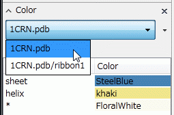 分子に対する着色着色という概念着色という概念は,チュートリアルDocuments/GUIのチュートリアル(CueMol2)/Step7でも説明されている通り,Rendererに対して適応することで,それに応じてRendererがObjectを着色して表示するというものでした. どういう場合に必要なのかしかし,Rendererではなく分子オブジェクト(MolCoord)ごとに色が決まっている場合が多く, 1つの分子に対して複数のrendererがある場合, それぞれが統一性が取れた色遣いになるようにするには, 各々のRendererに対して同色を一つ一つ設定してやる必要がありました. これでは面倒です. そこで,バージョン2.0.1.207では,新しく分子に対する着色,という機能を実装しました. 分子に対して大元となる着色を指定しておき, 随時Renderer側で「$molcol」という特殊キーワードを指定することで, 分子側の設定を参照できます. これで,必要に応じて分子で決まっている統一した着色を行うことができるわけです. 以下で実例を挙げて具体的な使い方を説明します. 具体例で解説以下では,crambin 1CRN.pdbを使用して具体的に説明します. サンプルファイルは, になります. Colorパレットで分子を選択従来,ColorパレットではDocuments/GUIのチュートリアル(CueMol2)/Step7にあるように rendererしか選択できませんでしたが,バージョン2.0.1.207以降では以下のように object (但し分子に限る)もリストに現れ,選択できるようになりました. 例えば,1CRN.pdbという分子を読み込んでribbon表示にした場合, 以上のように,「1CRN.pdb/ribbon1」以外に「1CRN.pdb」という項目も表示されるわけです. ここで,「1CRN.pdb」(分子object)を選択すると,分子に対する着色を編集できます. (デフォルトでは,Paint coloringで二次構造で色分けする状態になっています) 以下では,まずこのデフォルトの着色はデフォルトのまま置いておいて, 分子の色をどのようにしてrendererから参照するかを説明します. 分子の色をribbon rendererから参照まず,既にあるribbon rendererから分子色を参照するように変更します. 下図のように,Colorパレットで1CRN.pdb/ribbon1を選択し,右のプルダウンメニューからSolid coloringというのを選択します.すると,分子グラフィクスの方は白一色のribbon表示になります. そして次に,Default color項目の設定で,下図のように「Use mol color」という項目を選択します. $molcolという文字が入り,色は灰色になります(メニューを使わずに$molcolという文字を直接入れても同じ). GUIの部分の色は灰色になりますが,実際のribbon rendererの方の色は, 分子の着色が反映されて,二次構造ごとの着色になります. (ただ,元から二次構造ごとの着色になっていたため一見色に変化はないように見えますが...) 分子の色をballstick rendererから参照さらに,1CRN.pdbに対してさらにballstick rendererを作成します. デフォルトではCPK coloringになっているため,図のような表示になるでしょう. ここで,例えば炭素原子の色のみ,主鎖のリボン表示に合わせたいとします. 従来では,CPK coloringでは元素ごとにしか着色できなかった為, 炭素の色を変更すると,全部の炭素原子の色を変えることしかできませんでした. 以下のように,炭素の色の設定で「Use mol color」という項目を選択します. GUIの部分の色は灰色になりますが,グラフィクスのballstick rendererの炭素原子の色は, 下図のように主鎖のリボンと同じ色になります. 分子の着色を変更する次に,分子の着色を変更し,$molcolを使用しているrendererでの変化を見てみましょう. Colorパレットで,再び1CRN.pdbを選びます.そして,1〜10番の残基をピンク色に設定します.(具体的な方法はDocuments/GUIのチュートリアル(CueMol2)/Step8を参照) すると,分子グラフィクスの方は下図のように変化します. 残基番号1〜10番のribbon表示だけでなく,ballstick表示の炭素原子の色のみ変化していることが分かります. (ここまで操作した状態のqscファイルが,サンプルファイルmolcol_sample1.qscです) さらに例えば,分子の着色をrainbow coloringに変更すると,下図のようにribbonだけでなくballstickも 色が変化します. 論文の図とか以上の例からわかると思いますが,例えばよくある論文の図等だと,