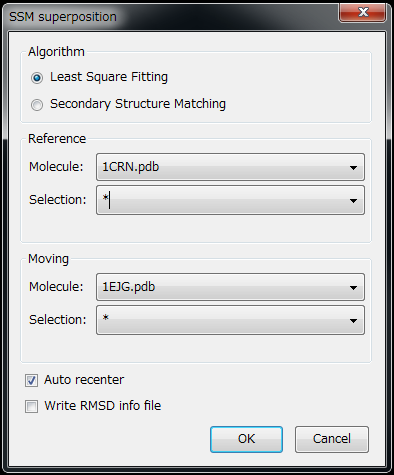 という特徴があります. CueMol1で実装されていた重ね合わせ機能とほぼ同じなのでDocuments/GUIのチュートリアル/StepA5も参考にしてください. ダイアログの各項目の意味は,
